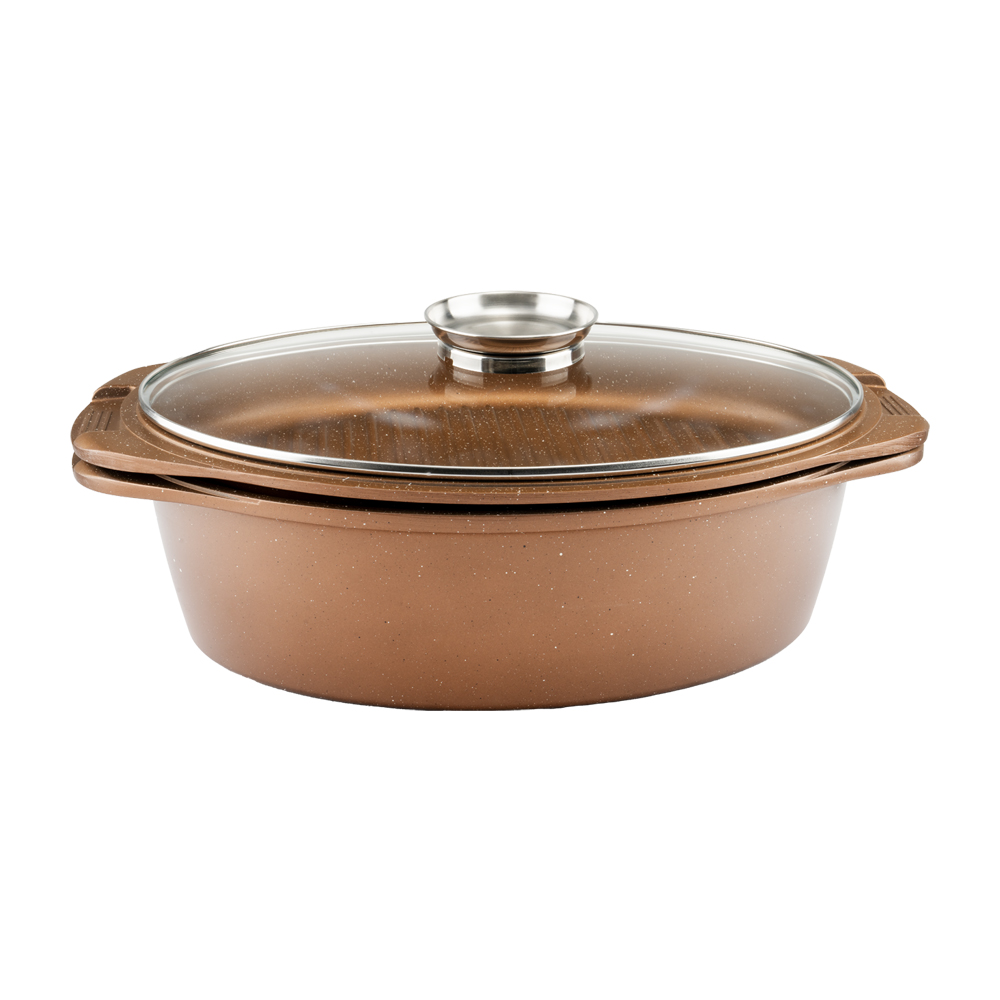 تابه مرغ پز دو دسته سایز 38 سه تیکه گرانیت طرح ایتالیا B ظرفی برای گریل، آب پز و تنوری کردن مرغ، ماهی و انواع گوشت روی اجاق گاز است. این ست شامل یک قابلمه بیضی بزرگ، یک تابه بیضی کوتاه و یک درب پیرکس میشود.
