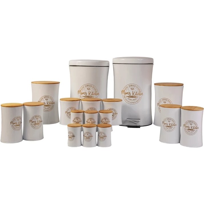 سرویس آشپزخانه 17 پارچه ام جی اس مدل کمرباریک شامل اصلیترین بانکهها و ظروف نگهدارنده هر آشپزخانه است. این ست دارای 4 بانکه حبوبات، 3 عدد بانکه متوسط، 6 بانکه ادویه، 2 بانکه قند و شکر و 1 بزرگ سطل زباله و 1 برنج اقلام اساسی هر آشپزخانهای، است.
