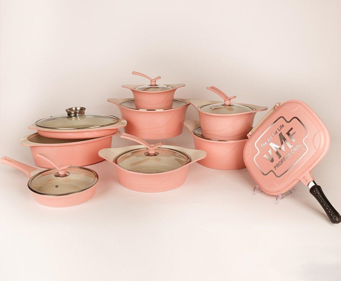 سرویس قابلمه 20 پارچه گرانیت VMF طرح کره رزگلد یک سرویس ظروف پخت و پز عالی برای هر سلیقهای است. این ست شامل چهار قابلمه در سایزهای 20/24/28/32 و تابه دو دسته سایز 28 بعلاوه یک تابه دوطرفه، یک تابه مرغ پز سه تکه، یک تابه دو دسته 28 و یک تابه تکدسته 24 میباشد.