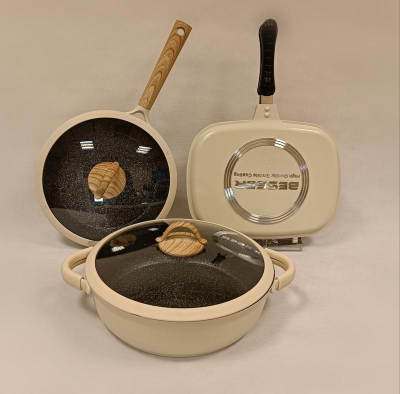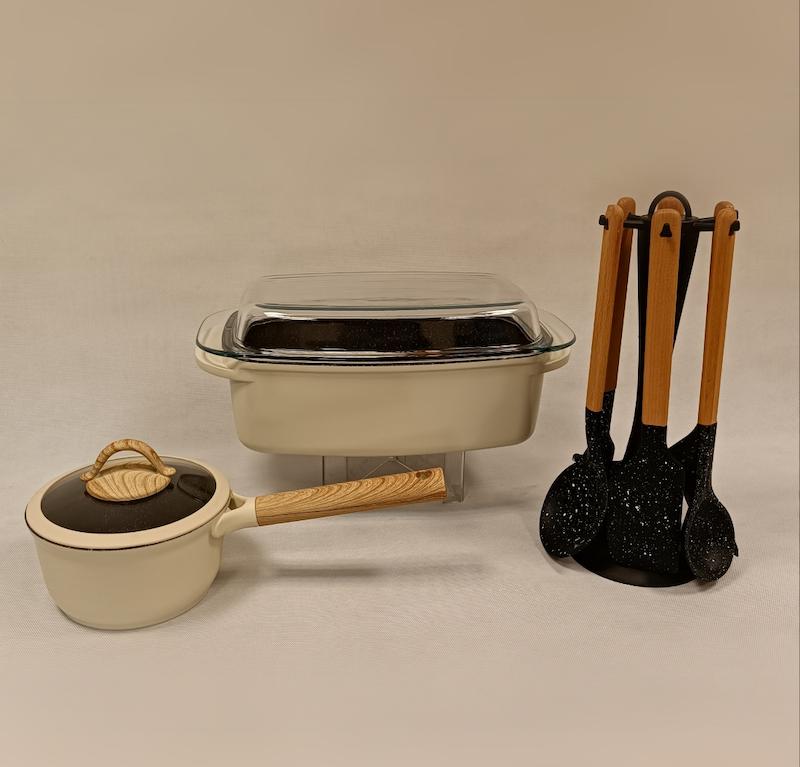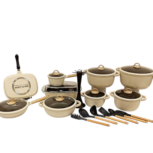 دستههای ارگونومیک و مقاوم در برابر حرارت، دربهای شیشهای مقاوم، و ترکیب رنگ کرم لوکس، جلوهای خاص به آشپزخانه میبخشد. این ست کاربردی شامل انواع قابلمه، ماهیتابه و لوازم آشپزی ضروری است تا پختوپز روزانه به تجربهای لذتبخش تبدیل شود.