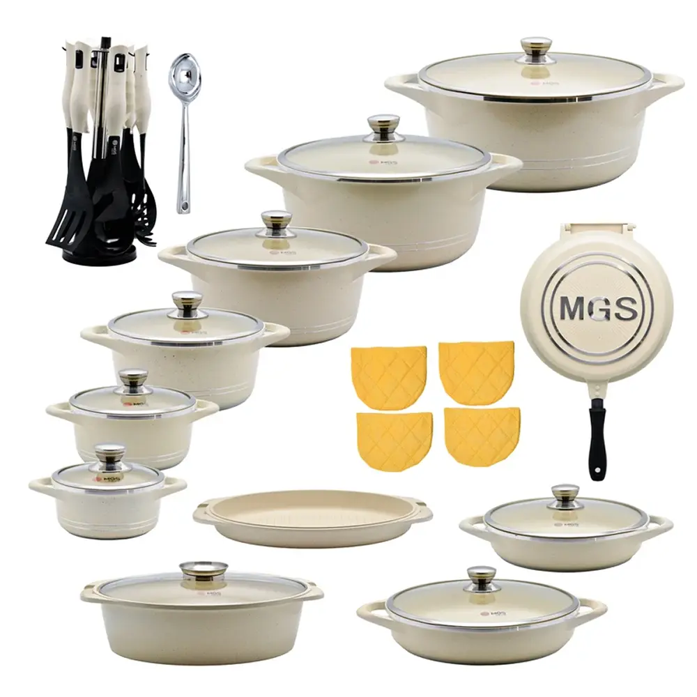 اگر به دنبال خرید یک سرویس قابلمه 16 پارچه فورج یراق طلایی MGS هستید که هم ظاهر زیبایی داشته باشد و هم از نظر کیفیت در سطح بالایی باشد، این مدل می تواند گزینهای ایدهآل برای شما باشد. این محصول نه تنها برای استفاده روزانه مناسب است، بلکه برای جهیزیه نیز انتخابی هوشمندانه بهشمار می رود. برند MGS با ارائه این سرویس تلاش کرده تا نهایت رضایت و دوام را برای مصرف کنندگان به ارمغان بیاورد.