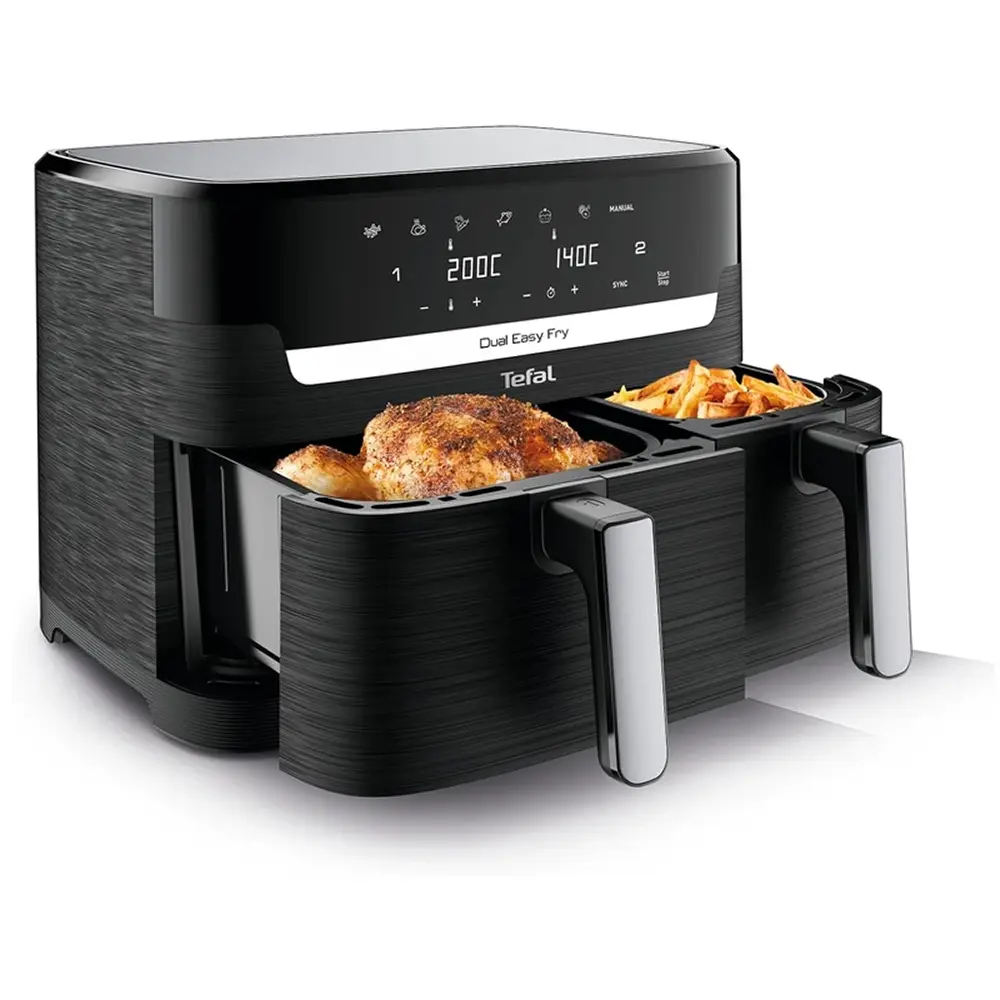 سرخ کن دو قلو تفال مدل EY9018 محصولی با طراحی حرفه ای، ظرفیت بالا و عملکرد هوشمند است که برای خانواده های پرجمعیت و علاقه مندان به پختوپز سالم طراحی شده است. این دستگاه با دو محفظه مجزا، امکان پخت همزمان دو نوع غذای مختلف بدون تداخل طعم و بو را فراهم می کند. قابلیت پخت بدون روغن با فناوری گردش هوای داغ (Air Pulse)، کنترل دیجیتال لمسی، تایمر هوشمند و قابلیت تنظیم دمای مجزا برای هر محفظه، این سرخ کن را به انتخابی ایدهآل برای آشپزخانه های مدرن تبدیل کرده است.